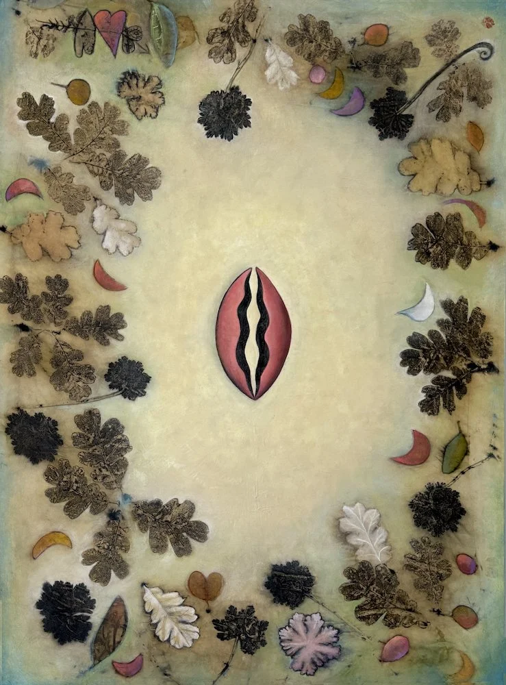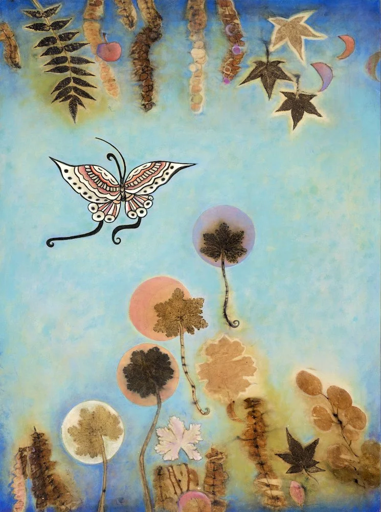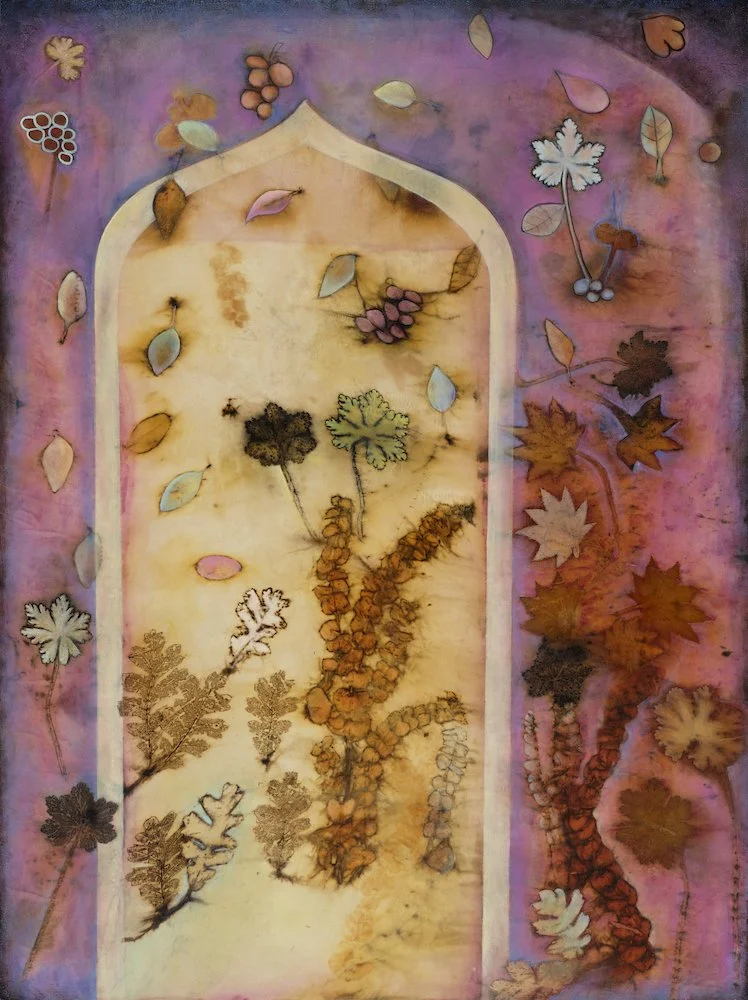Lisa Brinkman is a West Linn–based artist whose work is rooted in a lifelong communion with the natural world. From her forested “treehouse” home of nearly four decades, she creates lyrical mixed media paintings from eco-prints thatexplore our relationship to nature, spirit, and imagination. Her current process involves steaming raw silk with locally foraged plants—geranium, oak, maple, and sumac—producing organic, ethereal imprints. These eco-prints serve as the foundation for layered oil paintings that honor the rhythms, symbols, and cycles of the natural world.