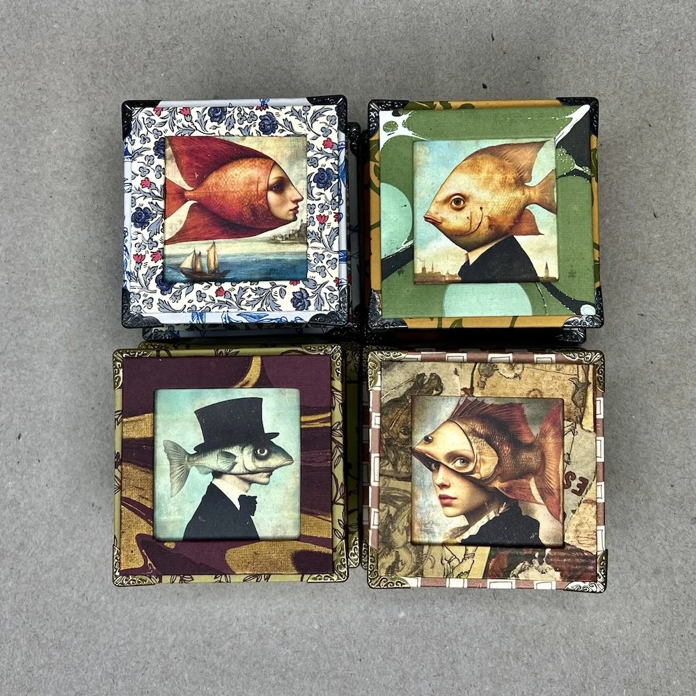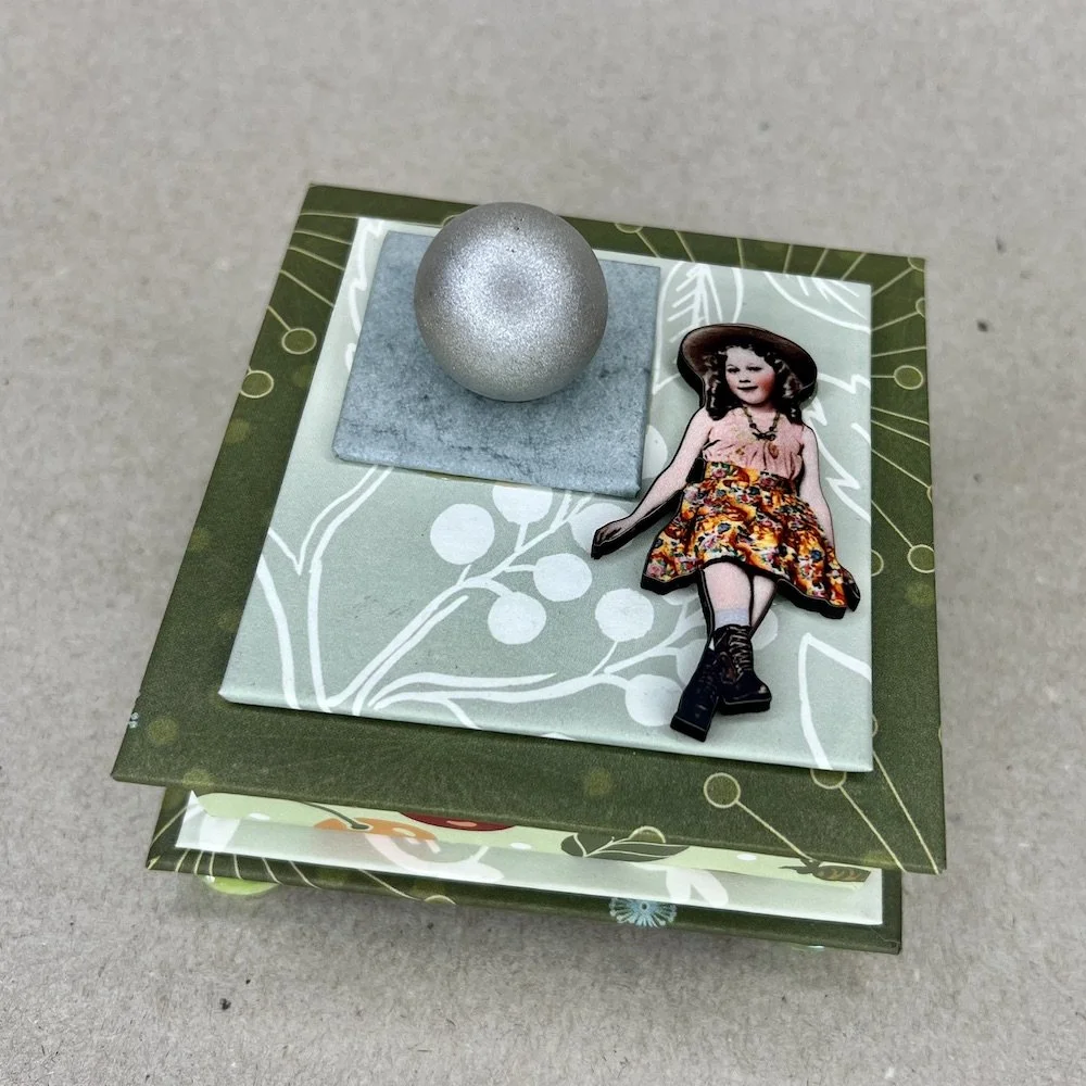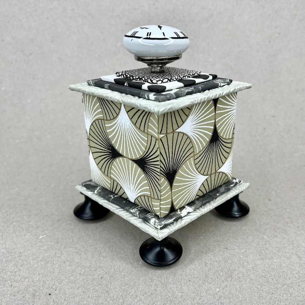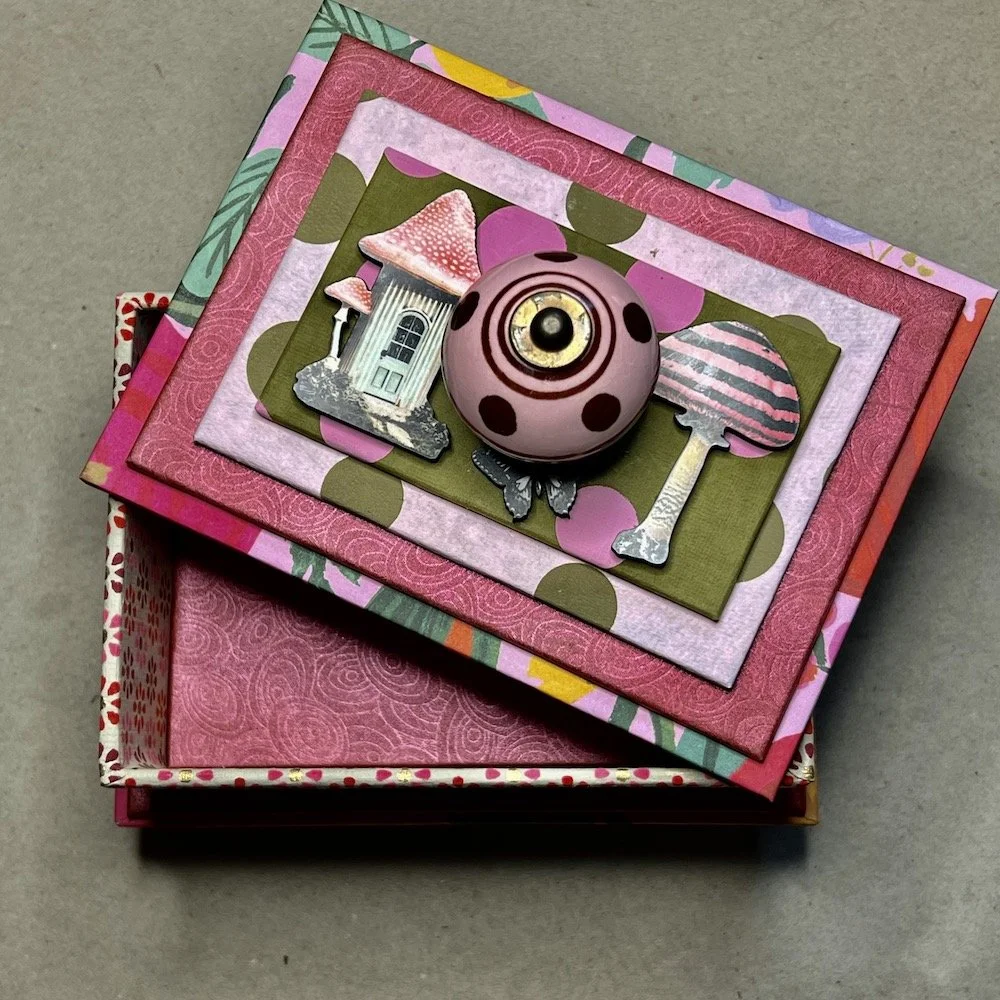 As the saying goes – “form follows function”. This is never truer than in my works with mixed media and paper. I have always been predisposed to make pieces that not only work as an attractive, intriguing and/or curious piece of art but also have a practical use or function. While I began my career in paper as a book artist I eventually gravitated more toward box forms as they offer nearly unlimited design opportunities and while not everyone is predisposed to write in a book, everyone has something to put in a box. Paper dominates as my medium (purchased, re-purposed and those that I have designed myself) and nearly every piece includes some other component such as turned wood, vintage doll parts or game pieces, letterpress, hand formed beads, shaped wires and so much more.