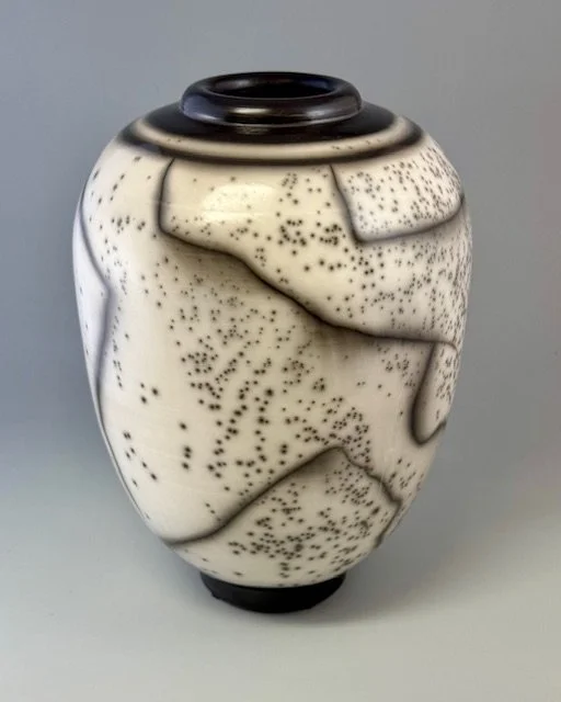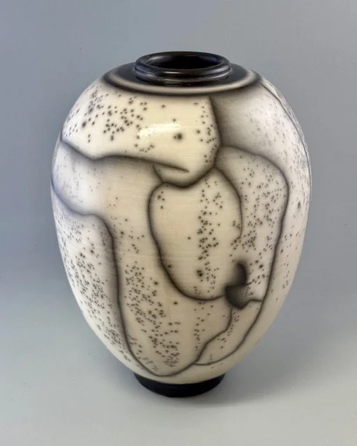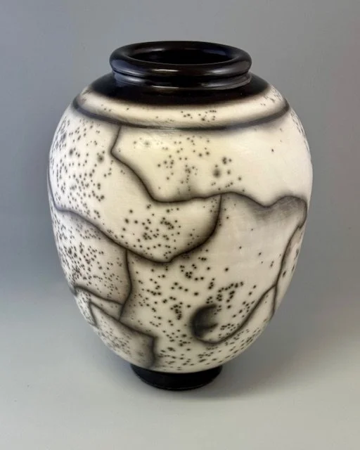 2. Contrasting Surfaces: The technique of reduction firing used in Naked Raku often results in a contrast between the dark, carbonized areas (from the reduction atmosphere in the chamber- a 55 gallon oil drum) and the lighter, more natural tones of the exposed clay body. Wylder expertly balances these contrasts, achieving stunning visual effects where the exposed clay may be smooth and polished, while other areas appear more rustic or charred.